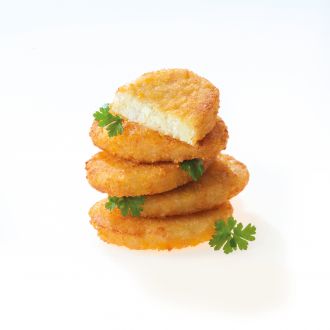 Made from 52 % fresh cauliflower and hearty cheese, the tasty medaillon is coated with a crispy cornflakes breading. Suitable for cooking in steamer oven.